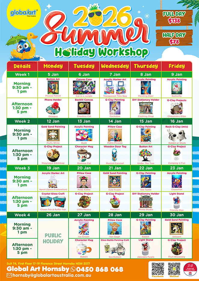 NOTE: Holiday workshops are only available for sale in the website until 1 day BEFORE the actual date of the holiday workshop. For more information, kindly contact your globalart center.