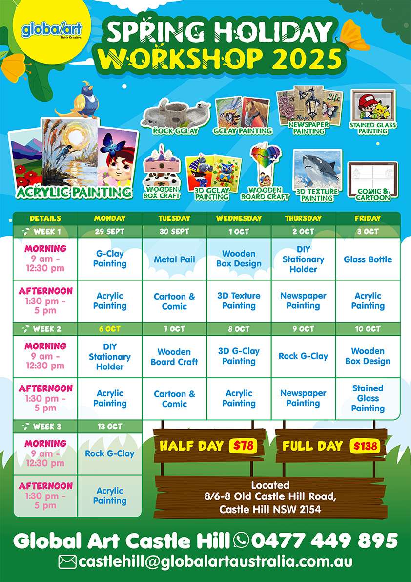 NOTE: Holiday workshops are only available for sale in the website until 1 day BEFORE the actual date of the holiday workshop. For more information, kindly contact your globalart center.