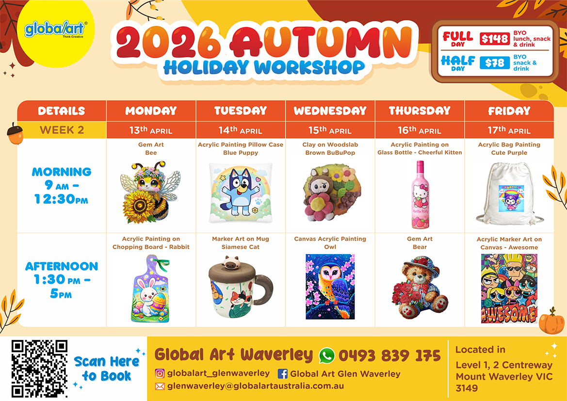 NOTE: Holiday workshops are only available for sale in the website until 1 day BEFORE the actual date of the holiday workshop. For more information, kindly contact your globalart center.