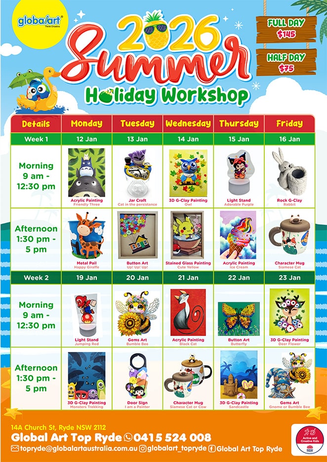 NOTE: Holiday workshops are only available for sale in the website until 1 day BEFORE the actual date of the holiday workshop. For more information, kindly contact your globalart center.